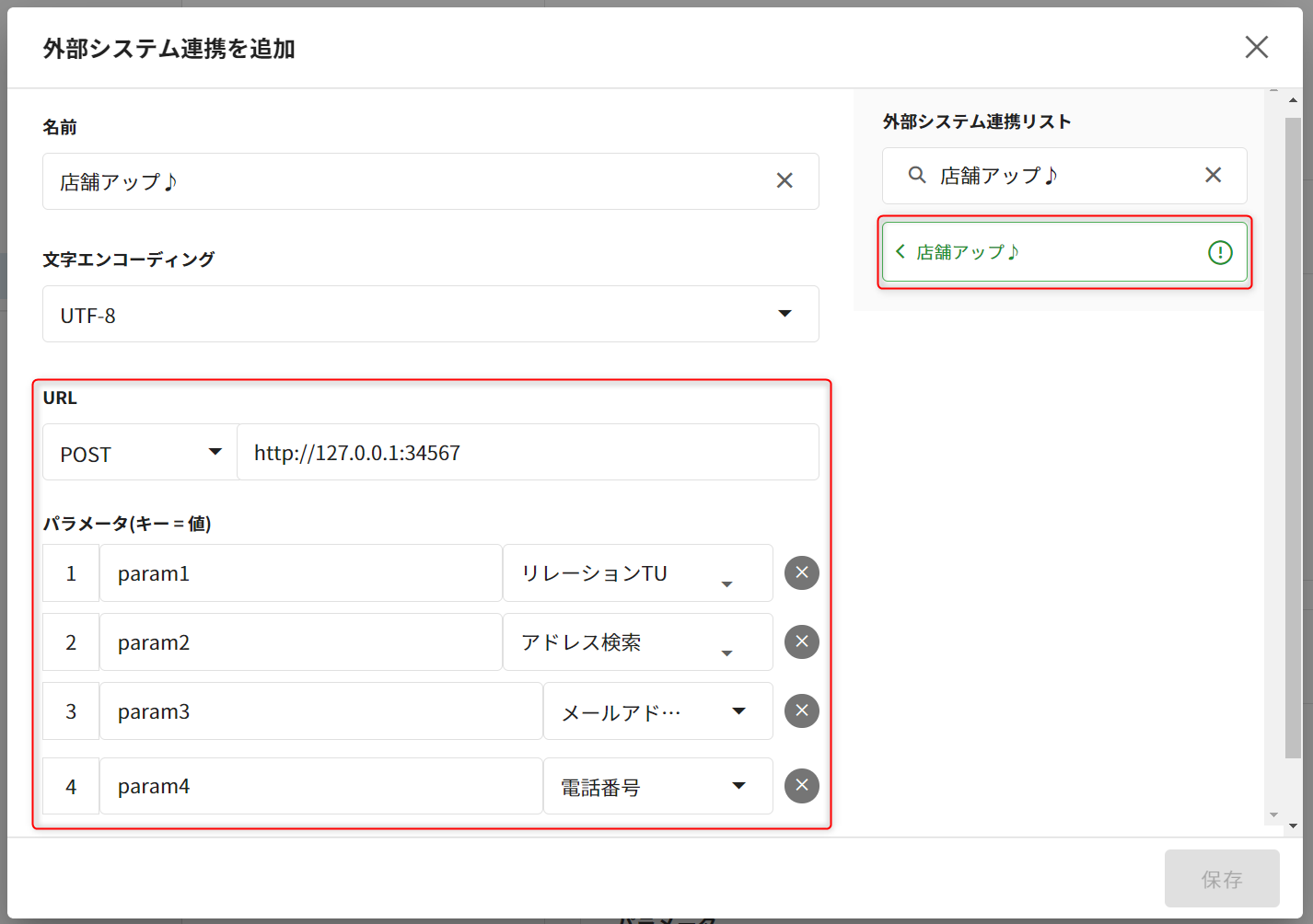 名前 好きな名前を入力してください。(例: 店舗アップ♪) 文字エンコーディング UTF-8 送信方法 (HTTP Method) POST URL http://127.0.0.1:34567