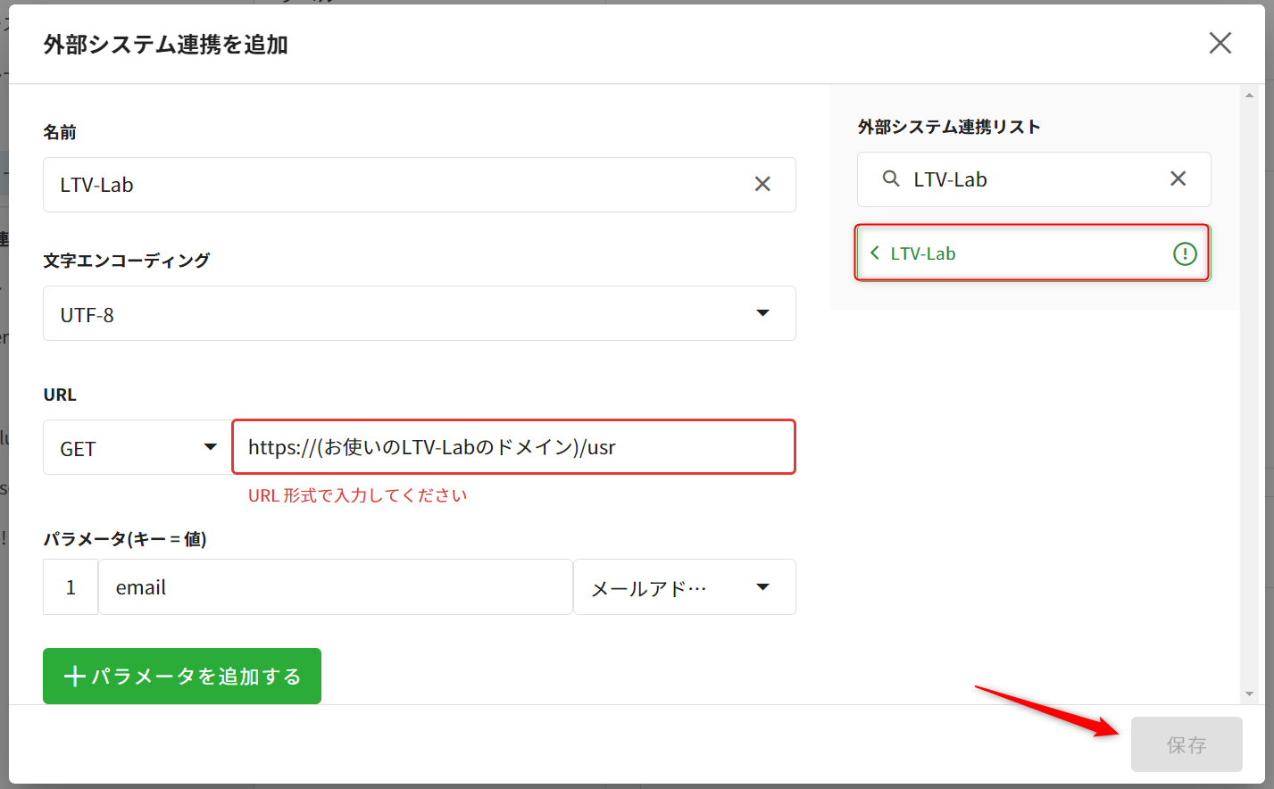 名前 好きな名前を入力してください。(例: LTV-Lab) 文字エンコーディング UTF-8 送信方法 (HTTP Method) GET URL https://(お使いのLTV-Lab・ふるさと-Labのドメイン)/usr