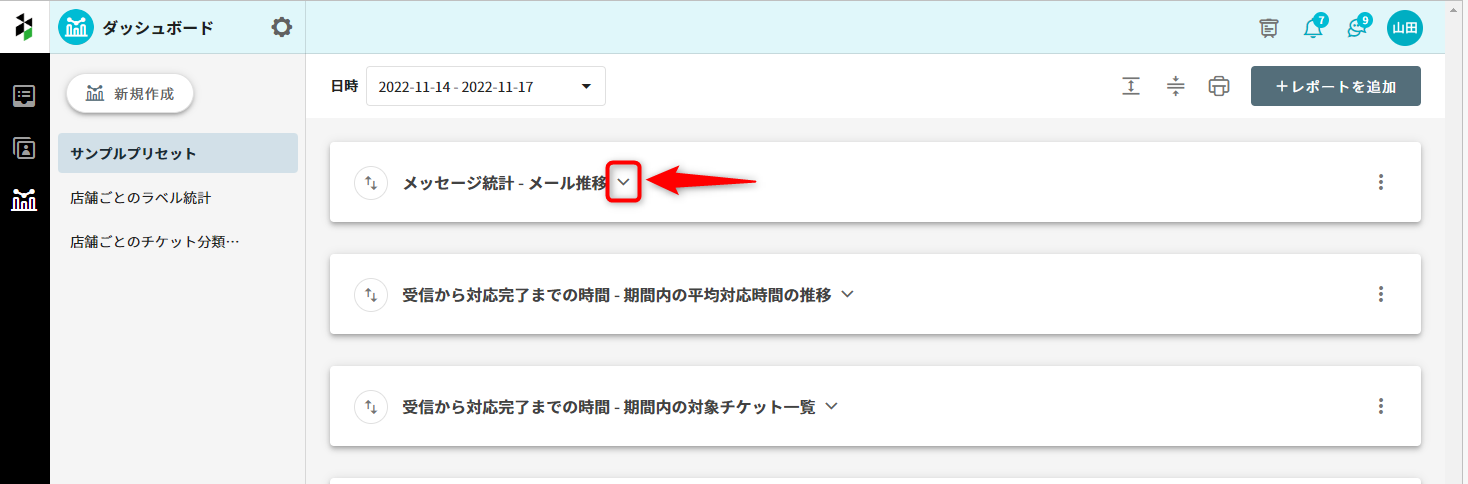 レポート名横のプルダウンを押下すると、レポートごとに開きます。
