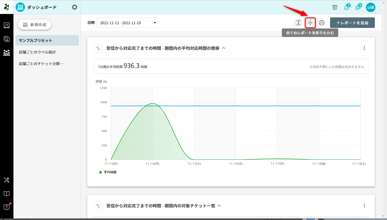 4.レポートが折りたたまれている場合、画面右上の[全てのレポートを開く]を押下すると、全てのレポートを開くことが可能です。
