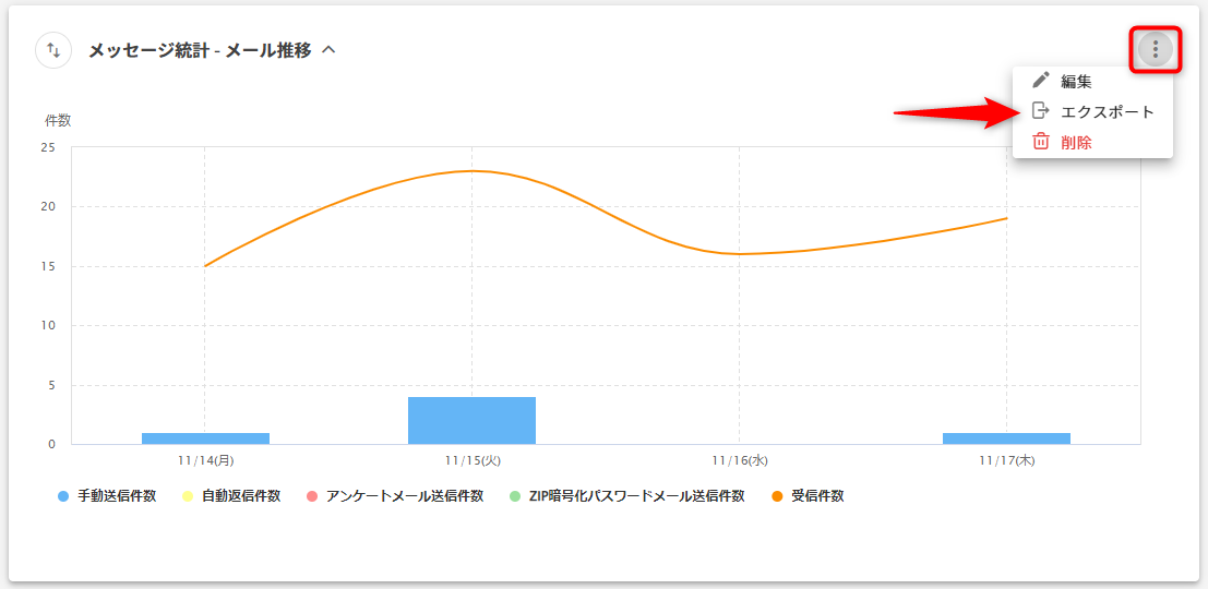 エクスポートするには、各レポートの右上のメニューアイコンより[エクスポート]を選択します。